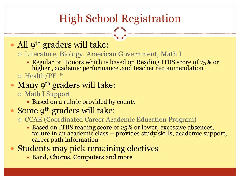High School Registration • All 9th graders will take: • Literature, Biology, American Government, Math I • Regular or Honors which is based on Reading ITBS score of 75% or higher , academic performance ,and teacher recommendation • Health/PE * • Many 9th graders will take: • Math I Support • Based on a rubric provided by county • Some 9th graders will take: • CCAE (Coordinated Career Academic Education Program) • Based on ITBS reading score of 25% or lower, excessive absences, failure in an academic class – provides study skills, academic support, career path information • Students may pick remaining electives • Band, Chorus, Computers and more