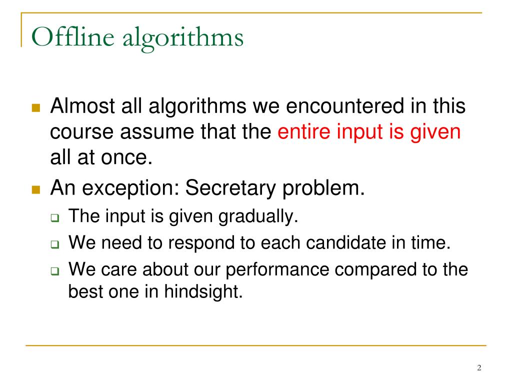 Offline algorithms • Almost all algorithms we encountered in this course assume that the entire input is given all at once. • An exception: Secretary problem. • The input is given gradually. • We need to respond to each candidate in time. • We care about our performance compared to the best one in hindsight.