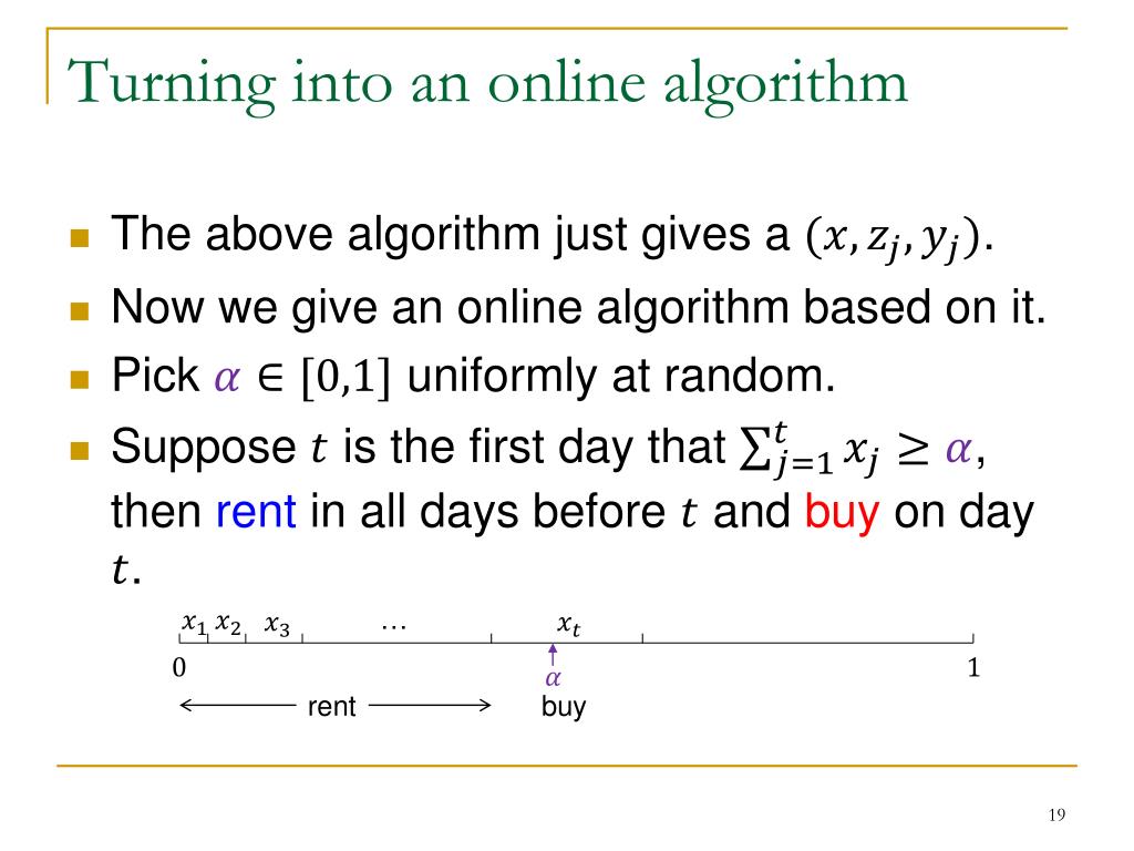 Turning into an online algorithm • The above algorithm just gives a . • Now we give an online algorithm based on it. • Pick uniformly at random. • Suppose is the first day that , then rent in all days before and buy on day . … rent buy