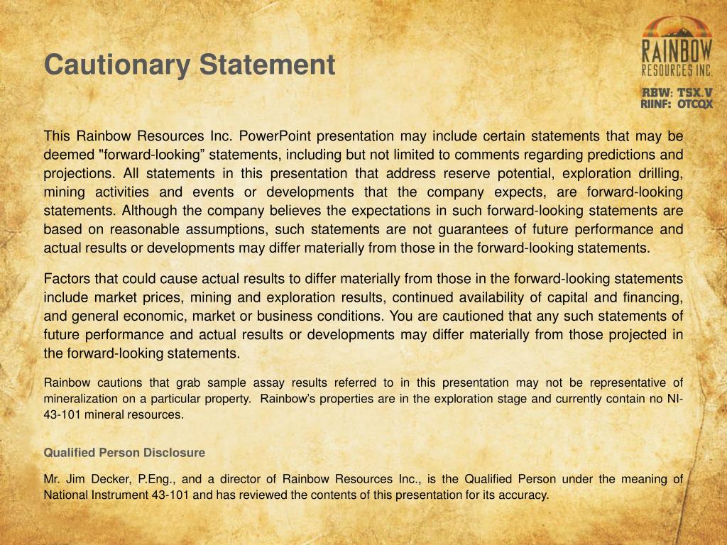 Cautionary Statement RIINF: OTCQX This Rainbow Resources Inc. PowerPoint presentation may include certain statements that may be deemed "forward-looking” statements, including but not limited to comments regarding predictions and projections. All statements in this presentation that address reserve potential, exploration drilling, mining activities and events or developments that the company expects, are forward-looking statements. Although the company believes the expectations in such forward-looking statements are based on reasonable assumptions, such statements are not guarantees of future performance and actual results or developments may differ materially from those in the forward-looking statements. Factors that could cause actual results to differ materially from those in the forward-looking statements include market prices, mining and exploration results, continued availability of capital and financing, and general economic, market or business conditions. You are cautioned that any such statements of future performance and actual results or developments may differ materially from those projected in the forward-looking statements. Rainbow cautions that grab sample assay results referred to in this presentation may not be representative of mineralization on a particular property. Rainbow’s properties are in the exploration stage and currently contain no NI-43-101 mineral resources. Qualified Person Disclosure Mr. Jim Decker, P.Eng., and a director of Rainbow Resources Inc., is the Qualified Person under the meaning of National Instrument 43-101 and has reviewed the contents of this presentation for its accuracy.