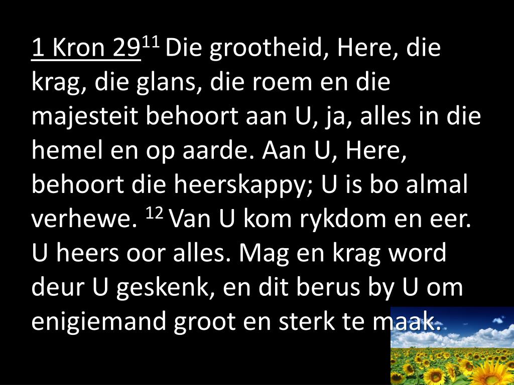 1 Kron 2911 Die grootheid, Here, die krag, die glans, die roem en die majesteit behoort aan U, ja, alles in die hemel en op aarde. Aan U, Here, behoort die heerskappy; U is bo almal verhewe. 12 Van U kom rykdom en eer. U heers oor alles. Mag en krag word deur U geskenk, en dit berus by U om enigiemand groot en sterk te maak.