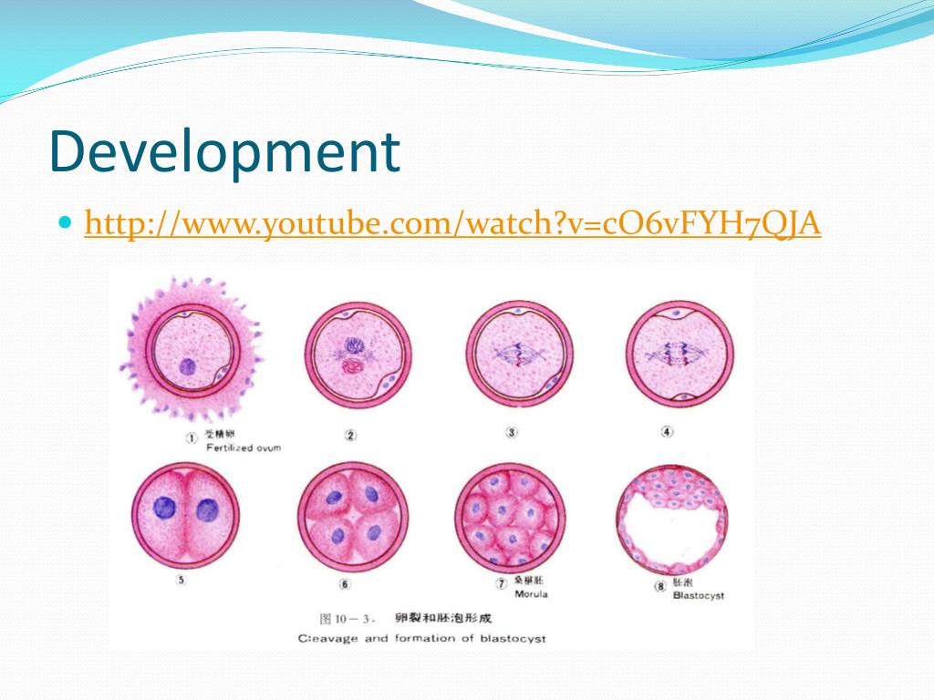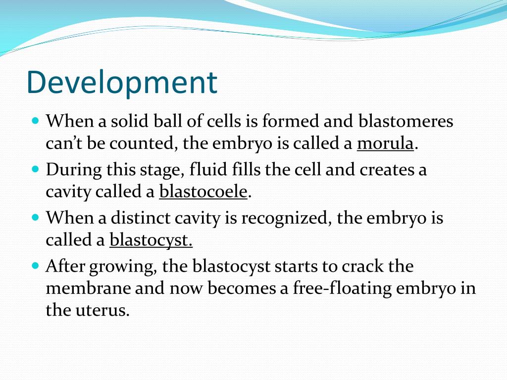 Development • When a solid ball of cells is formed and blastomeres can’t be counted, the embryo is called a morula. • During this stage, fluid fills the cell and creates a cavity called a blastocoele. • When a distinct cavity is recognized, the embryo is called a blastocyst. • After growing, the blastocyst starts to crack the membrane and now becomes a free-floating embryo in the uterus.