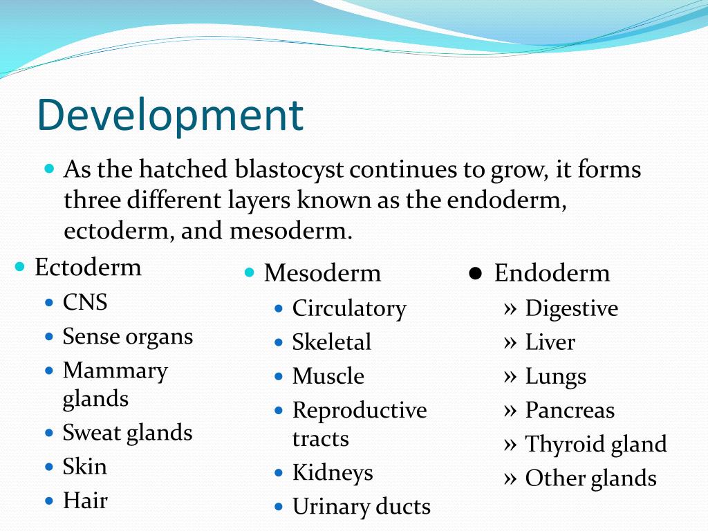 Development • As the hatched blastocyst continues to grow, it forms three different layers known as the endoderm, ectoderm, and mesoderm. • Ectoderm • CNS • Sense organs • Mammary glands • Sweat glands • Skin • Hair • Mesoderm • Circulatory • Skeletal • Muscle • Reproductive tracts • Kidneys • Urinary ducts • Endoderm • Digestive • Liver • Lungs • Pancreas • Thyroid gland • Other glands