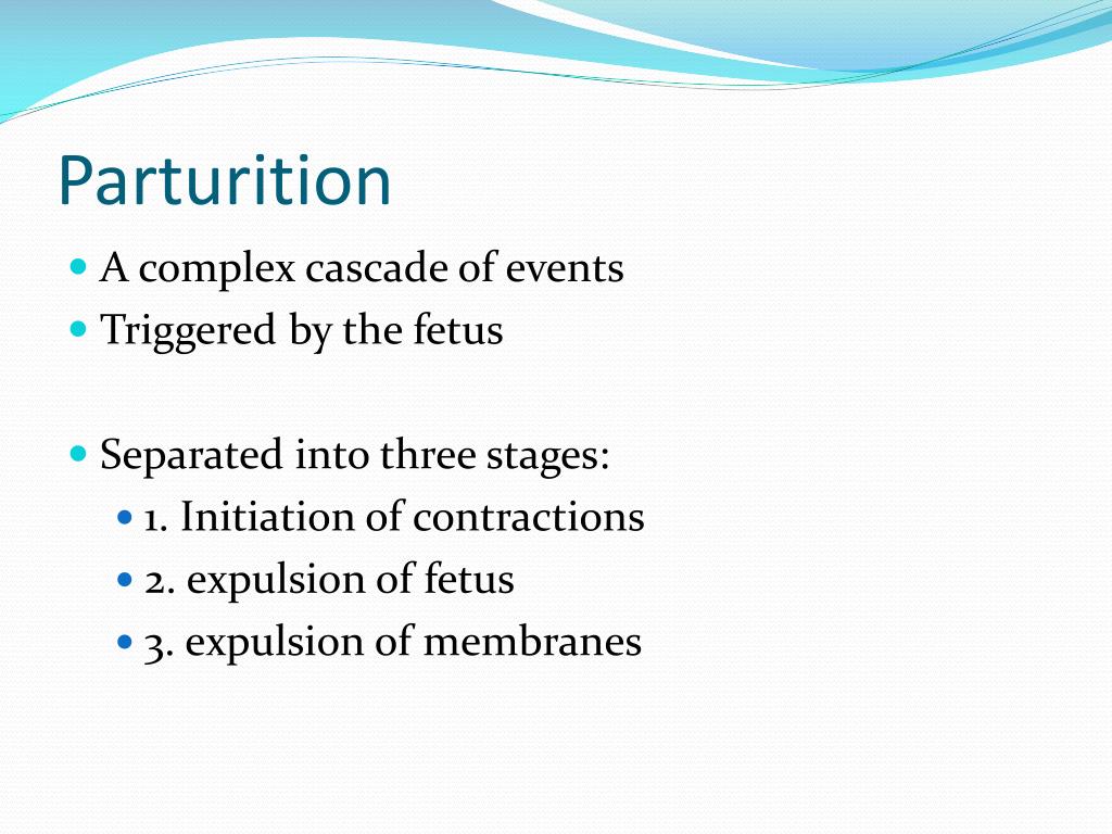 Parturition • A complex cascade of events • Triggered by the fetus • Separated into three stages: • 1. Initiation of contractions • 2. expulsion of fetus • 3. expulsion of membranes