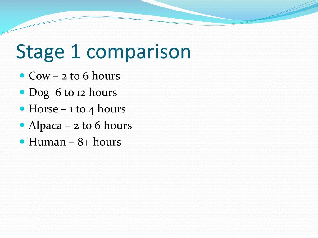 Stage 1 comparison • Cow – 2 to 6 hours • Dog 6 to 12 hours • Horse – 1 to 4 hours • Alpaca – 2 to 6 hours • Human – 8+ hours