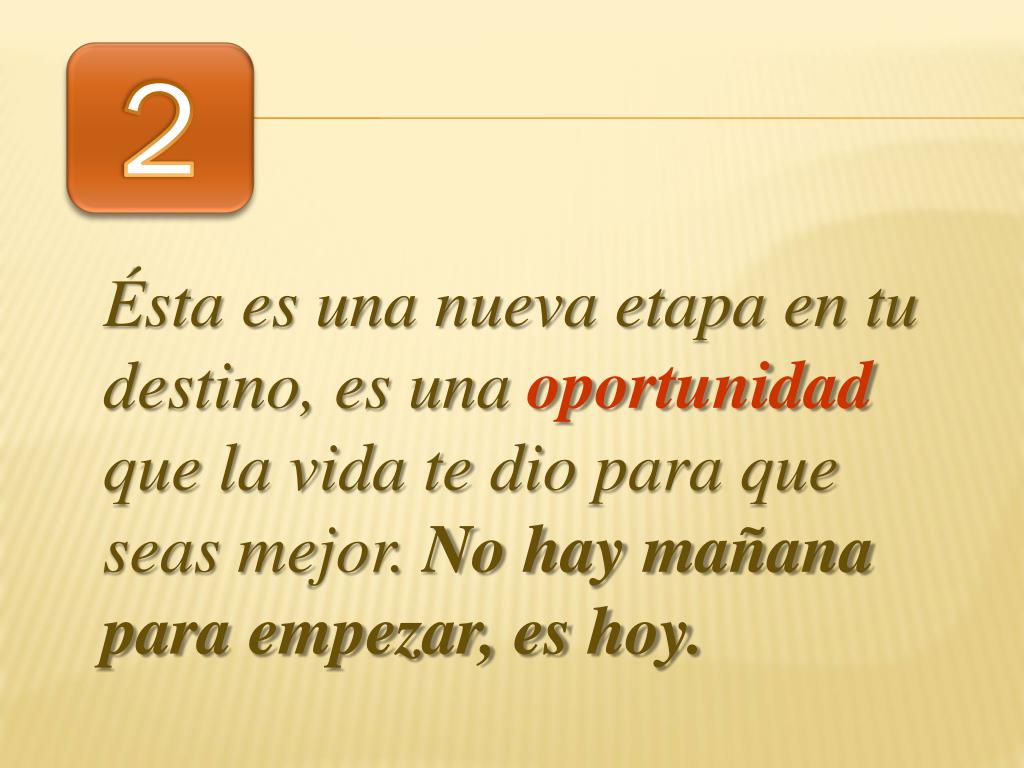 2 Ésta es una nueva etapa en tu destino, es una oportunidad que la vida te dio para que seas mejor. No hay mañana para empezar, es hoy.