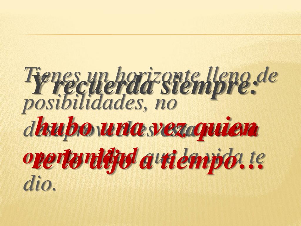 Tienes un horizonte lleno de posibilidades, no desaproveches esta nueva oportunidad que la vida te dio. Y recuerda siempre: hubo una vez quien te lo dijo a tiempo…