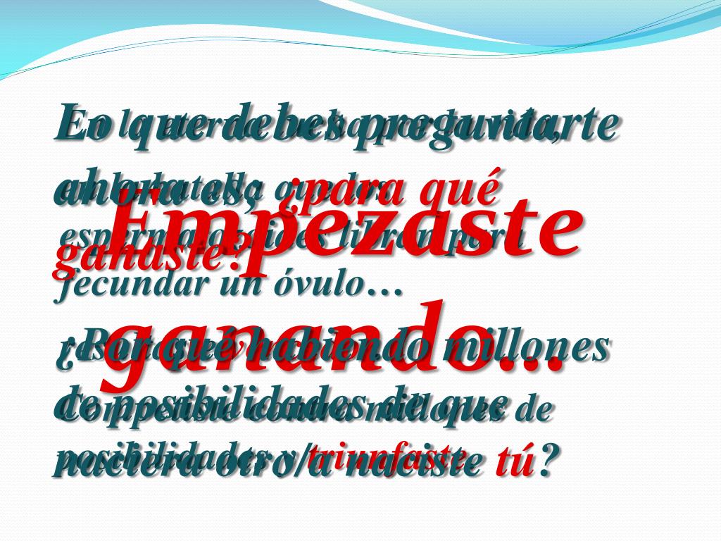 Lo que debes preguntarte ahora es; ¿para qué ganaste? En la eterna lucha por la vida, en la batalla que los espermatozoides libran para fecundar un óvulo… Empezaste ganando… ¿Por qué habiendo millones de posibilidades de que naciera otro/a naciste tú? resultaste vencedor. Competiste contra millones de posibilidades y triunfaste.