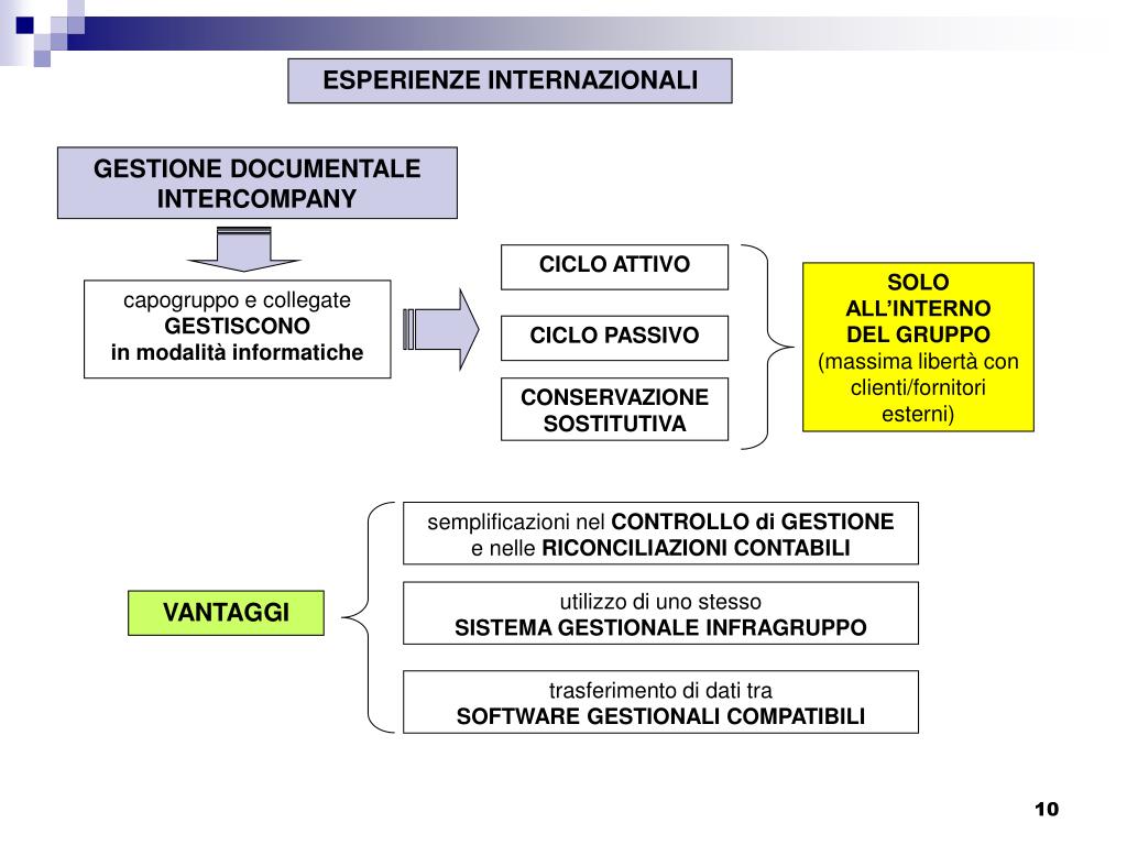 ESPERIENZE INTERNAZIONALI GESTIONE DOCUMENTALE INTERCOMPANY CICLO ATTIVO SOLO ALL’INTERNO DEL GRUPPO (massima libertà con clienti/fornitori esterni) capogruppo e collegate GESTISCONO in modalità informatiche CICLO PASSIVO CONSERVAZIONE SOSTITUTIVA semplificazioni nel CONTROLLOdi GESTIONE e nelle RICONCILIAZIONI CONTABILI utilizzo di uno stesso SISTEMA GESTIONALE INFRAGRUPPO VANTAGGI trasferimento di dati tra SOFTWARE GESTIONALI COMPATIBILI