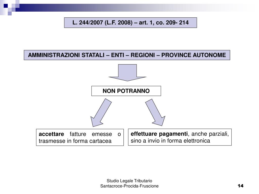 L. 244/2007 (L.F. 2008)– art. 1, co. 209- 214 AMMINISTRAZIONI STATALI – ENTI – REGIONI – PROVINCE AUTONOME NON POTRANNO effettuare pagamenti, anche parziali, sino a invio in forma elettronica accettare fatture emesse o trasmesse in forma cartacea Studio Legale Tributario Santacroce-Procida-Fruscione 14