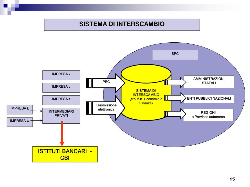 SISTEMA DI INTERSCAMBIO SPC SISTEMA DI INTERSCAMBIO (c/o Min. Economia e Finanze) IMPRESA x PEC AMMINISTRAZIONI STATALI IMPRESA y ENTI PUBBLICI NAZIONALI IMPRESA z Trasmissione elettronica IMPRESA k INTERMEDIARI PRIVATI REGIONI e Province autonome IMPRESA w ISTITUTI BANCARI - CBI