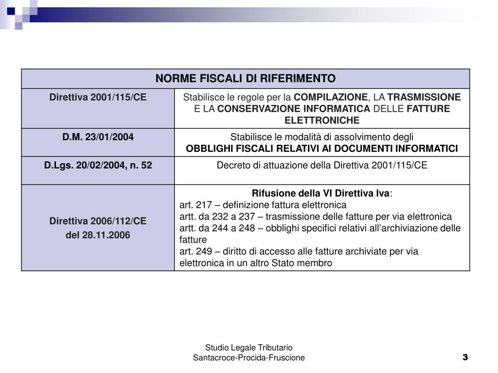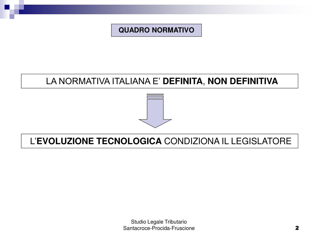 QUADRO NORMATIVO LA NORMATIVA ITALIANA E’ DEFINITA, NON DEFINITIVA L’EVOLUZIONE TECNOLOGICA CONDIZIONA IL LEGISLATORE Studio Legale Tributario Santacroce-Procida-Fruscione 2