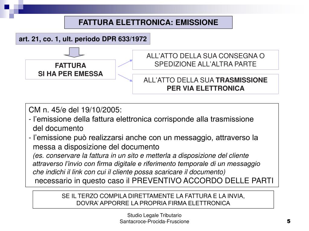 FATTURA ELETTRONICA DOCUMENTO INFORMATICO predisposto in forma elettronica, con garanzia di: ATTESTAZIONE DELLA DATA AUTENTICITA’ DELL’ORIGINE INTEGRITA’ DEL CONTENUTO art. 21, co. 3, DPR 633/1972 … RISPETTIVAMENTE GARANTITE MEDIANTE APPOSIZIONE SU CIASCUNA FATTURA O SUL LOTTO DI FATTURE MEDIANTE SISTEMI EDI DI TRASMISSIONE ELETTRONICA RIFERIMENTO TEMPORALE Electronic Data Interchange Sistema trasmissione elettronica dei dati FIRMA ELETTRONICA QUALIFICATA Studio Legale Tributario Santacroce-Procida-Fruscione 4