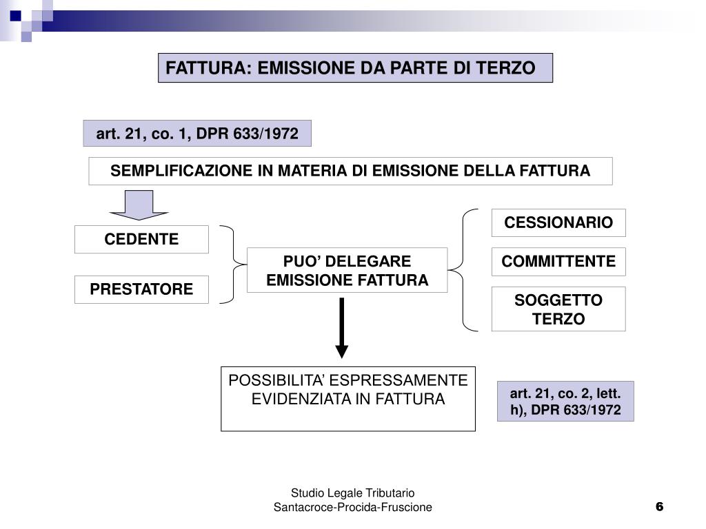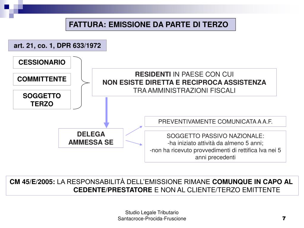 FATTURA: EMISSIONE DA PARTE DI TERZO art. 21, co. 1, DPR 633/1972 SEMPLIFICAZIONE IN MATERIA DI EMISSIONE DELLA FATTURA CESSIONARIO CEDENTE PUO’ DELEGARE EMISSIONE FATTURA COMMITTENTE PRESTATORE SOGGETTO TERZO POSSIBILITA’ ESPRESSAMENTE EVIDENZIATA IN FATTURA art. 21, co. 2, lett. h), DPR 633/1972 Studio Legale Tributario Santacroce-Procida-Fruscione 6