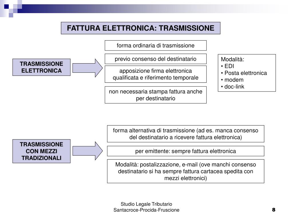 FATTURA ELETTRONICA: TRASMISSIONE forma ordinaria di trasmissione previo consenso del destinatario • Modalità: • EDI • Posta elettronica • modem • doc-link TRASMISSIONE ELETTRONICA apposizione firma elettronica qualificata e riferimento temporale non necessaria stampa fattura anche per destinatario forma alternativa di trasmissione (ad es. manca consenso del destinatario a ricevere fattura elettronica) TRASMISSIONE CON MEZZI TRADIZIONALI per emittente: sempre fattura elettronica Modalità: postalizzazione, e-mail (ove manchi consenso destinatario si ha sempre fattura cartacea spedita con mezzi elettronici) Studio Legale Tributario Santacroce-Procida-Fruscione 8