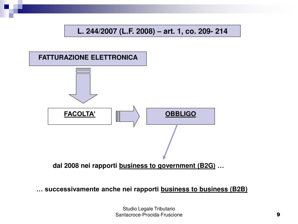 L. 244/2007 (L.F. 2008)– art. 1, co. 209- 214 FATTURAZIONE ELETTRONICA FACOLTA’ OBBLIGO dal 2008 nei rapporti business to government (B2G) … … successivamente anche nei rapporti business to business (B2B) Studio Legale Tributario Santacroce-Procida-Fruscione 9