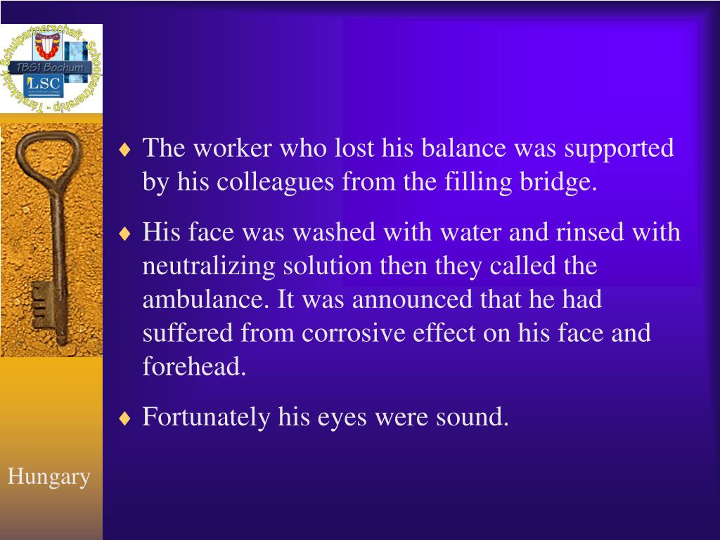 The accident • On 6th October in 1998 at 7 am. a worker, who filled acid at rail-chlorsulphonic acid filling station of the Tisza Region's Chemical Works in Szolnok(TVM),was ordered to fill more acid into the wagon standing at the station. • There could be l or 2 dls of water in the pipe which flew into the chlorsulphonic acid and immediately reacted on it. • The arising vapour stuck into the worker’s face through the filling pipe.