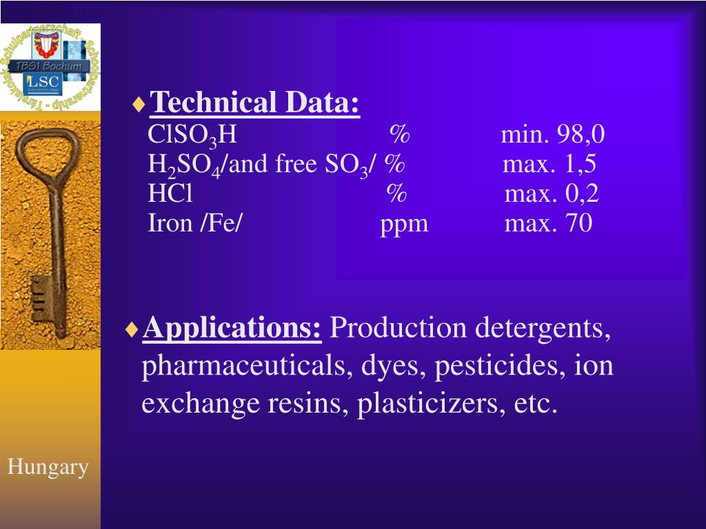 Technical Data:ClSO3H % min. 98,0 H2SO4/and free SO3/ % max. 1,5HCl % max. 0,2 Iron /Fe/ ppm max. 70 • Applications: Production detergents, pharmaceuticals, dyes, pesticides, ion exchange resins, plasticizers, etc.