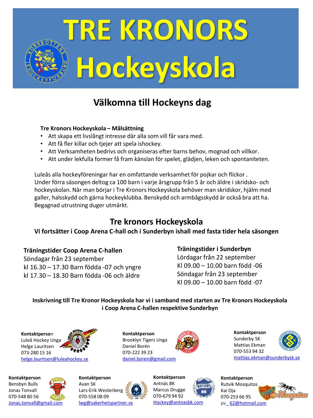 TRE KRONORS Hockeyskola Välkomna till Hockeyns dag • Tre Kronors Hockeyskola – Målsättning • Att skapa ett livslångt intresse där alla som vill får vara med. • Att få fler killar och tjejer att spela ishockey. • Att Verksamheten bedrivs och organiseras efter barns behov, mognad och villkor. • Att under lekfulla former få fram känslan för spelet, glädjen, leken och spontaniteten. Luleås alla hockeyföreningar har en omfattande verksamhet för pojkar och flickor . Under förra säsongen deltog ca 100 barn i varje årsgrupp från 5 år och äldre i skridsko- och hockeyskolan. När man börjar i Tre Kronors Hockeyskola behöver man skridskor, hjälm med galler, halsskydd och gärna hockeyklubba. Benskydd och armbågsskydd är också bra att ha. Begagnad utrustning duger utmärkt. Tre kronors Hockeyskola Vi fortsätter i Coop Arena C-hall och i Sunderbyn ishall med fasta tider hela säsongen Träningstider i Sunderbyn Lördagar från 22 september Kl09.00 – 10.00 barn född -06 Söndagar från 23 september Kl 09.00 – 10.00 barn född -07 Träningstider Coop Arena C-hallen Söndagar från 23 september kl 16.30 – 17.30 Barn födda -07 och yngre kl17.30 – 18.30 Barn födda -06 och äldre Inskrivning till Tre Kronor Hockeyskola har vi i samband med starten av Tre Kronors Hockeyskola i Coop Arena C-hallen respektive Sunderbyn Kontaktperson Sunderby SK Mattias Ekman 070-553 94 32 mattias.ekman@sunderbysk.se Kontaktperson Brooklyn Tigers Unga Daniel Borén 070-222 39 23 daniel.boren@gmail.com Kontaktperson Luleå Hockey Unga Helge Lauritsen 073-280 15 16 helge.lauritsen@luleahockey.se Kontaktperson Antnäs BK Marcus Drugge 070-679 94 92 Hockey@antnasbk.com Kontaktperson Avan SK Lars-Erik Westerberg 070-558 08 09 lwg@sakerhetspartner.se Kontaktperson Bensbyn Bulls Jonas Tonvall 070-548 80 56 Jonas.tonvall@gmail.com Kontaktperson RutvikMosquitos Kai Oja 070-253 66 95 pv_62@hotmail.com