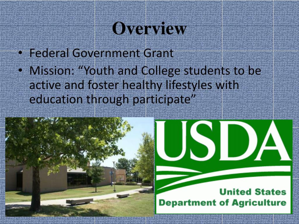 USDA Equity Grant Summer 2012. Leander Loretto AIS 497 Internship II Spring 2013. Overview. Federal Government Grant Mission: “Youth and College students to be active and foster healthy lifestyles with education through participate”. Why USDA Internship?.